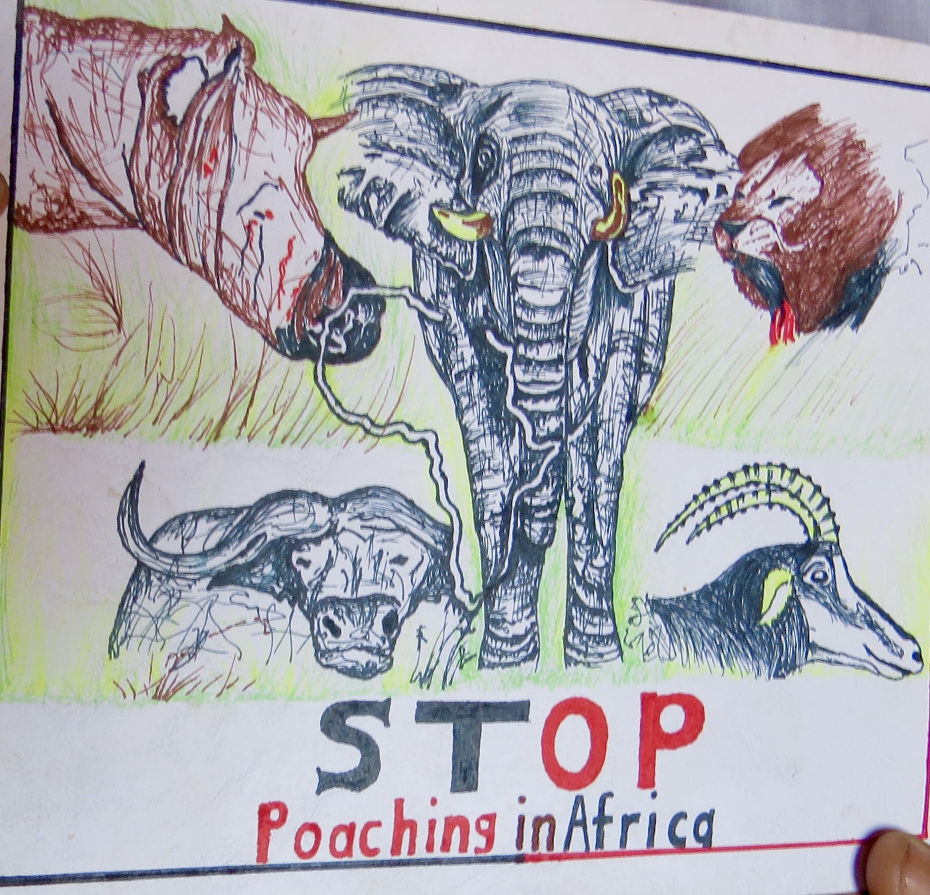 One of the side benefits of connecting creativity with Conservation is being able to identify and mentor young artists, as well as expanding the creativity and creative thinking of all the children we reach. A good example of this process was a young naturally talented artist, named Thembelani ,whom we met at Mosi oa Tunya ("Smoke that Thunders") high school, one of the largest schools in Zimbabwe. He was 16 when we met him, and had designed and drawn his own anti-poaching poster.(Below) With Anne's mentoring and our continuing support of the schools art programs, he is now a 20-year-old professional artist.