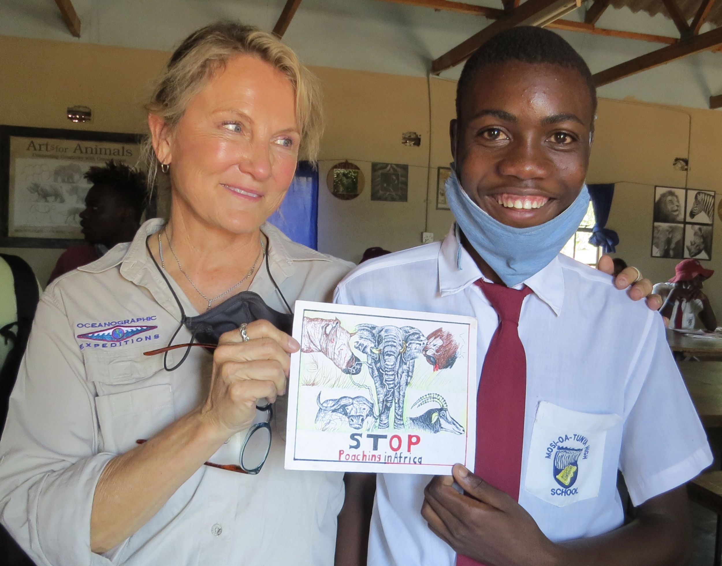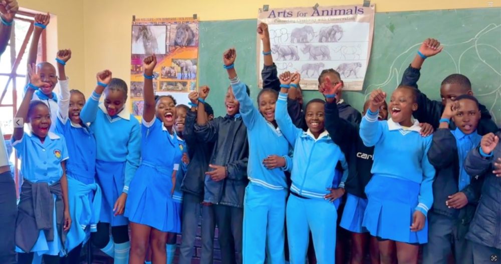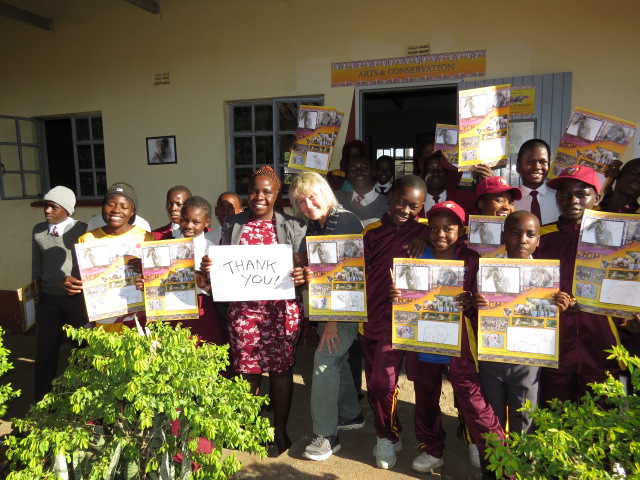 Here's one more photograph of some of the students we are working with at Mosi Oa Tunya high school in Victoria Falls- taken in front of the new "Arts and Conservation" building you helped us renovate. In South Africa, we printed 3000 new posters which enable the children to create their own wildlife drawings and bring them home to spread the Wildlife Conservation message to their families and neighbors. Most of these children also make the pledge to become a "Wildlife Protector" and proudly wear the blue wristband we give them for making that commitment.