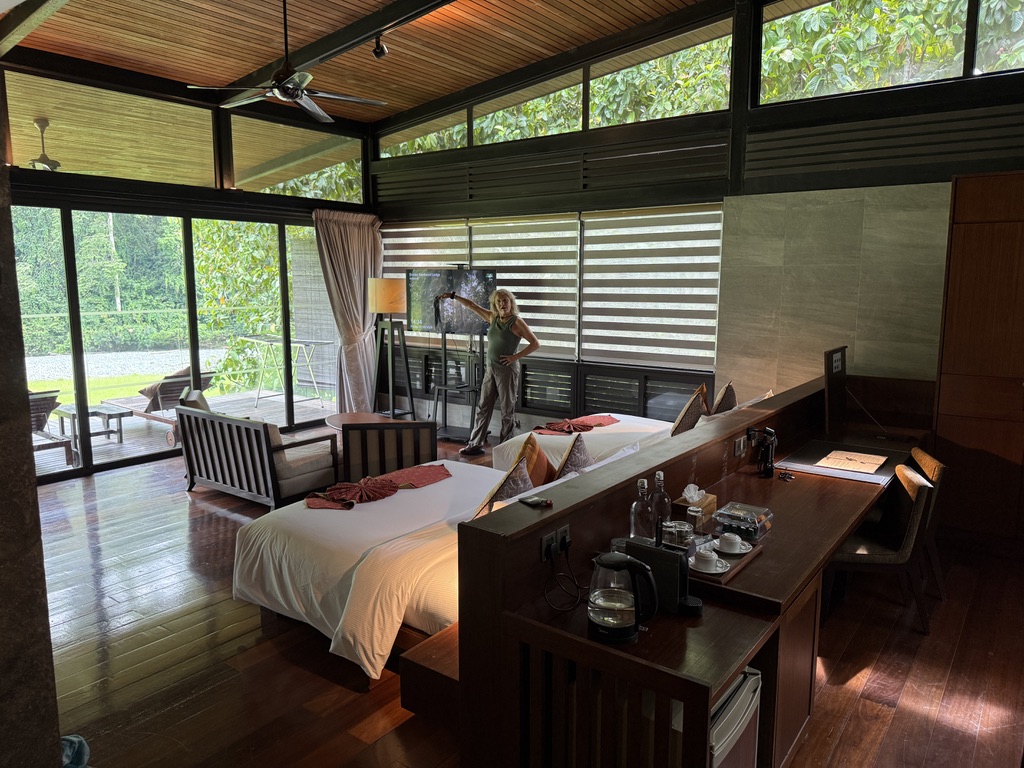 We visited Orangutan orphanages and sanctuaries, and were treated to wild Orangutans on the grounds and even on the roofs of our lodge. We visited a Sun Bear sanctuary and learned about the endangered and reclusive Sun Bears of Borneo. We visited one of the largest cave systems in the world, rafted on a wild river in the middle of a primative jungle, and walked among trees that towered literally hundreds of feet over our heads, while avoiding leeches under foot. Borneo was a journey back in time to an area that is much like it existed thousands of years ago, and we will describe more in the photographs below since many of the experiences we had were quite difficult to describe.