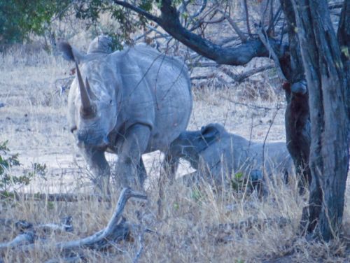 While sitting around the campfire at the Boma, a white rhino and calf wandered close by
