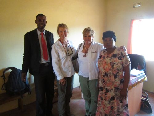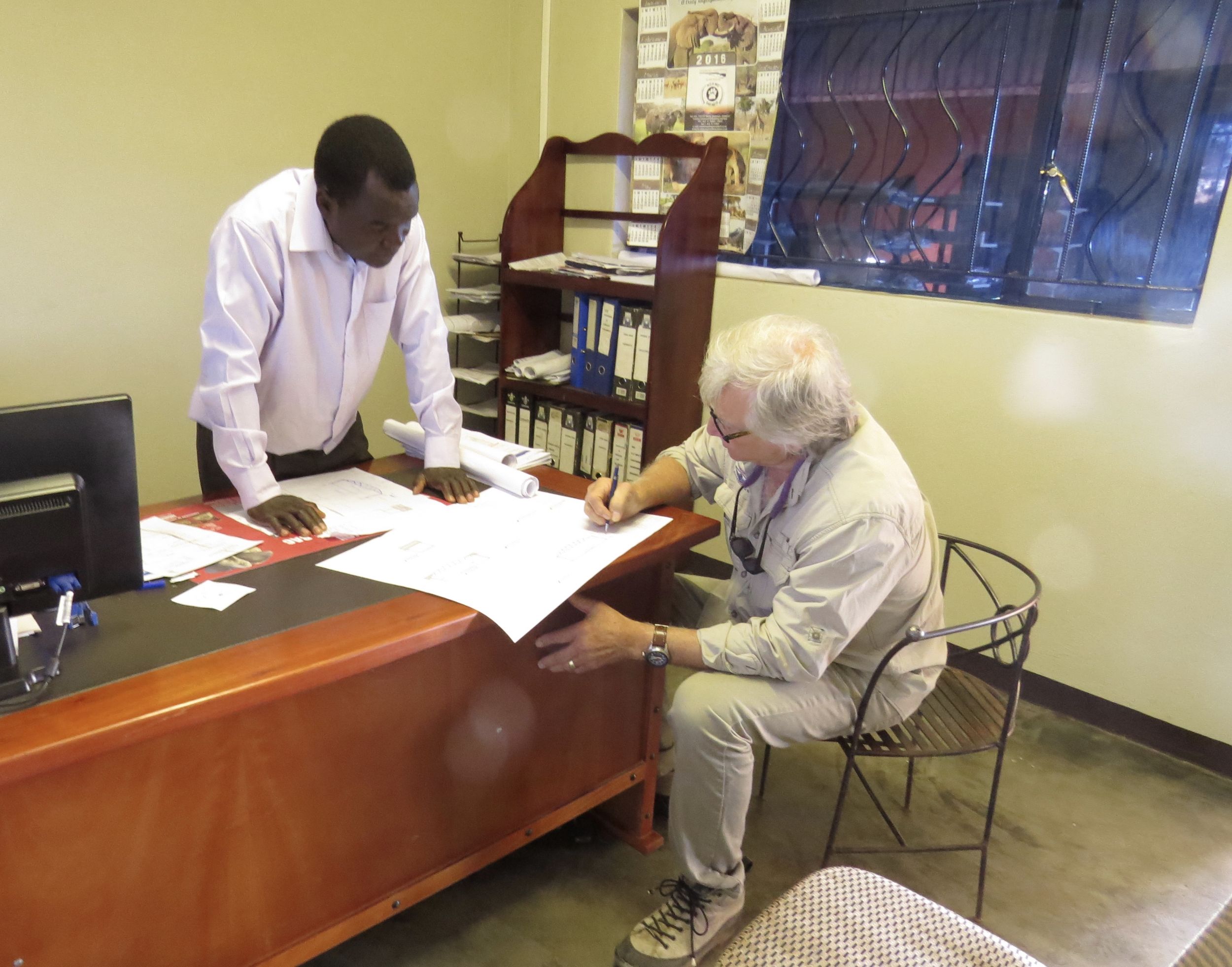 Anne, and Sue Goatley the "Children in the Wilderness" represenative meet with the principle and the local education minister to discuss teaching wildlife conservation and art.