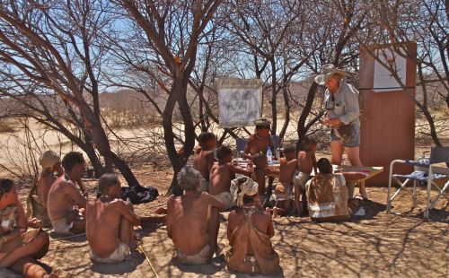 With our poster wired between 2 Mopani trees (the only shade in the Kalahari desert), and using an old door to draw on, we spoke to the bush kids and thir parents about wildlife.
